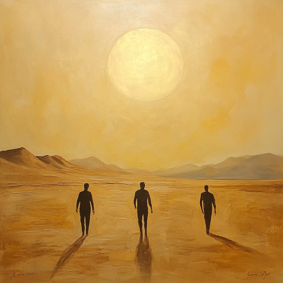 As they slept in the heat of the day, the desert air was sweet in a way it rarely is. The three men inhaled the sweet hot air and waited for the night when the sun would cease to boil their bodies and the moon would climb over the dunes to light their way once again. They had not made it far enough on their first day to survive the desert, both green-eyes and V knew that. They would either need to find water or increase their pace if they were going to make it to Lyonesse before death called for them.