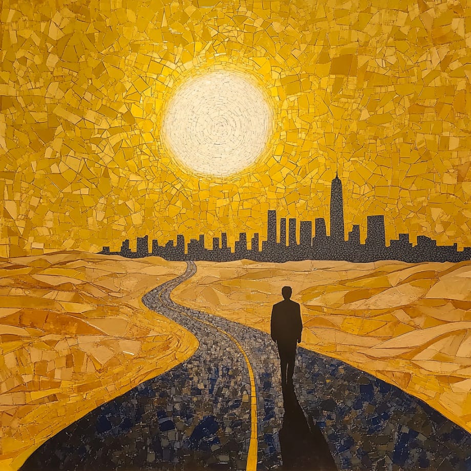 V sat on the scenery for the entire morning, until the number of cars decreased again and the sun was high in the sky. He got up and continued his walk. He thought he was only a few minutes away from the center of the city, but the concrete was as deceptive as the mirages in the desert. His journey was only half-complete. It took him as long to walk through the expanses of concrete as it took him to walk from the worksite to the edge of the capital.