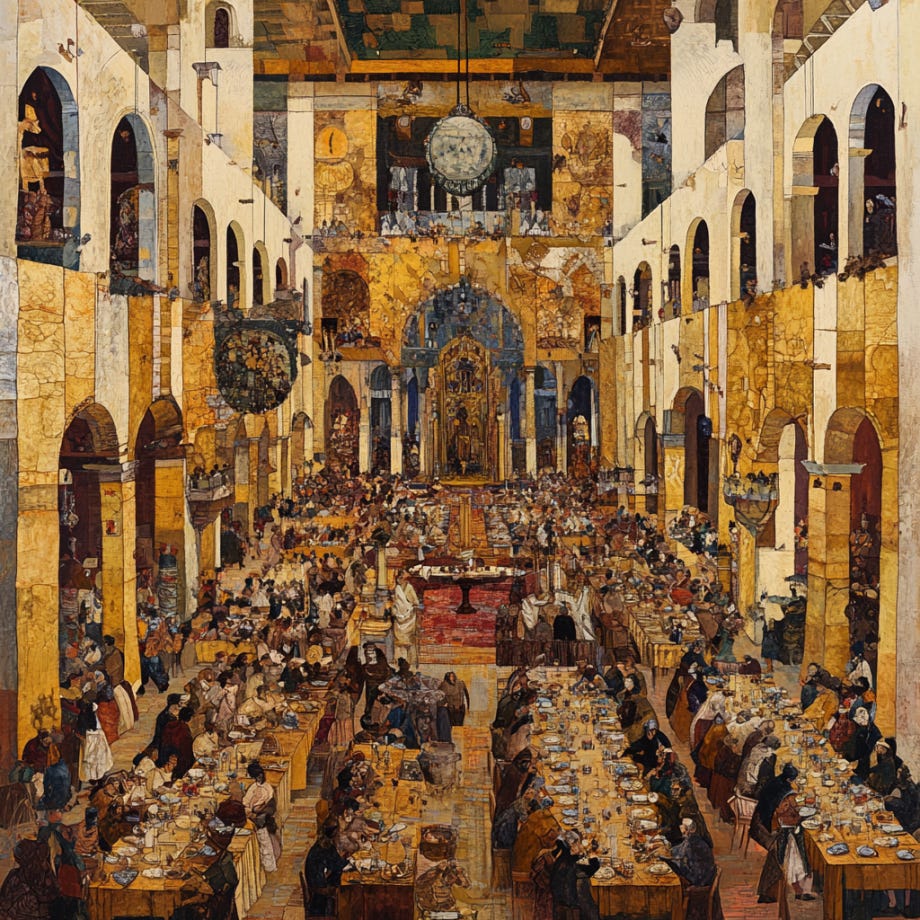V was seated next to a young woman at a very long table that ran the length of the ballroom. In the front of the hall was a smaller table with five chairs. The chair in the center of those five chairs was raised above the others, more like a throne than a chair. This was Harold’s table and four of the five chairs were presently occupied. The throne was empty. Harold’s table at the front and V’s very long table on the side were raised on a platform above the floor below. On the floor below there were many circular tables with many people dressed in fine clothes that didn’t flow in the same way as those at the tables above them.