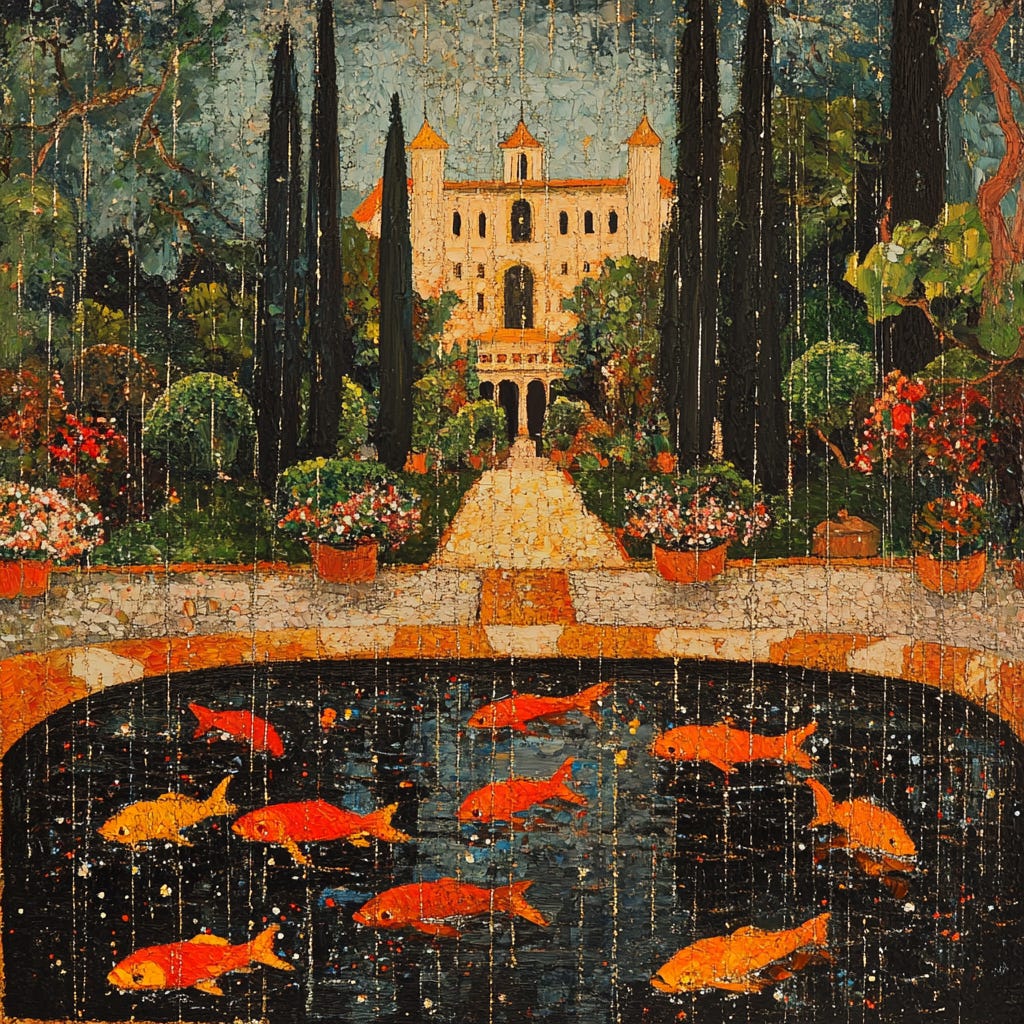 V rounded a corner and noticed a pond filled with orange in the middle of one of the beautiful gardens. The orange moved in streams below the water and V was drawn out from his covered pathway onto the grass and walked over to the pond under cover of a thick blanket of white clouds in the sky above.