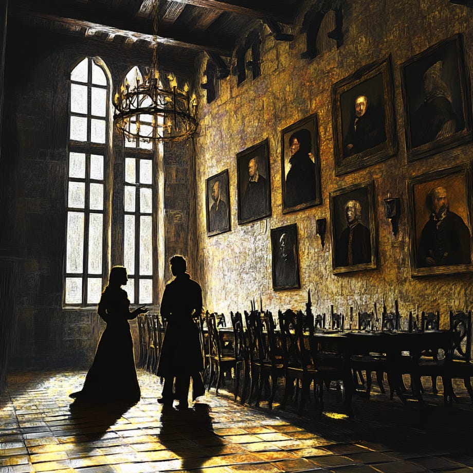 V was alone again, so he looked up to the ceiling again. He noticed some of the men on horseback were archers. They shot arrows over the vast expanse of the ceiling. V was following the arc of one of those frozen arrows when he heard another voice call out in the darkness.