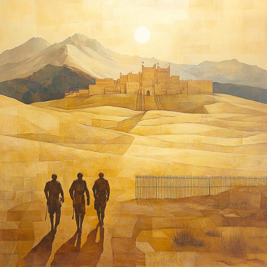 Three men emerged from the desert. They were greeted with M30 rifles. There was a fence, a guard tower, guards, a closed border. Green-eyes stepped forward, his friend and V stayed back. Green-eyes walked up to the gate. A soldier emerged. He had an M30 like the soldiers in the guard tower. It was pointed at green-eyes.